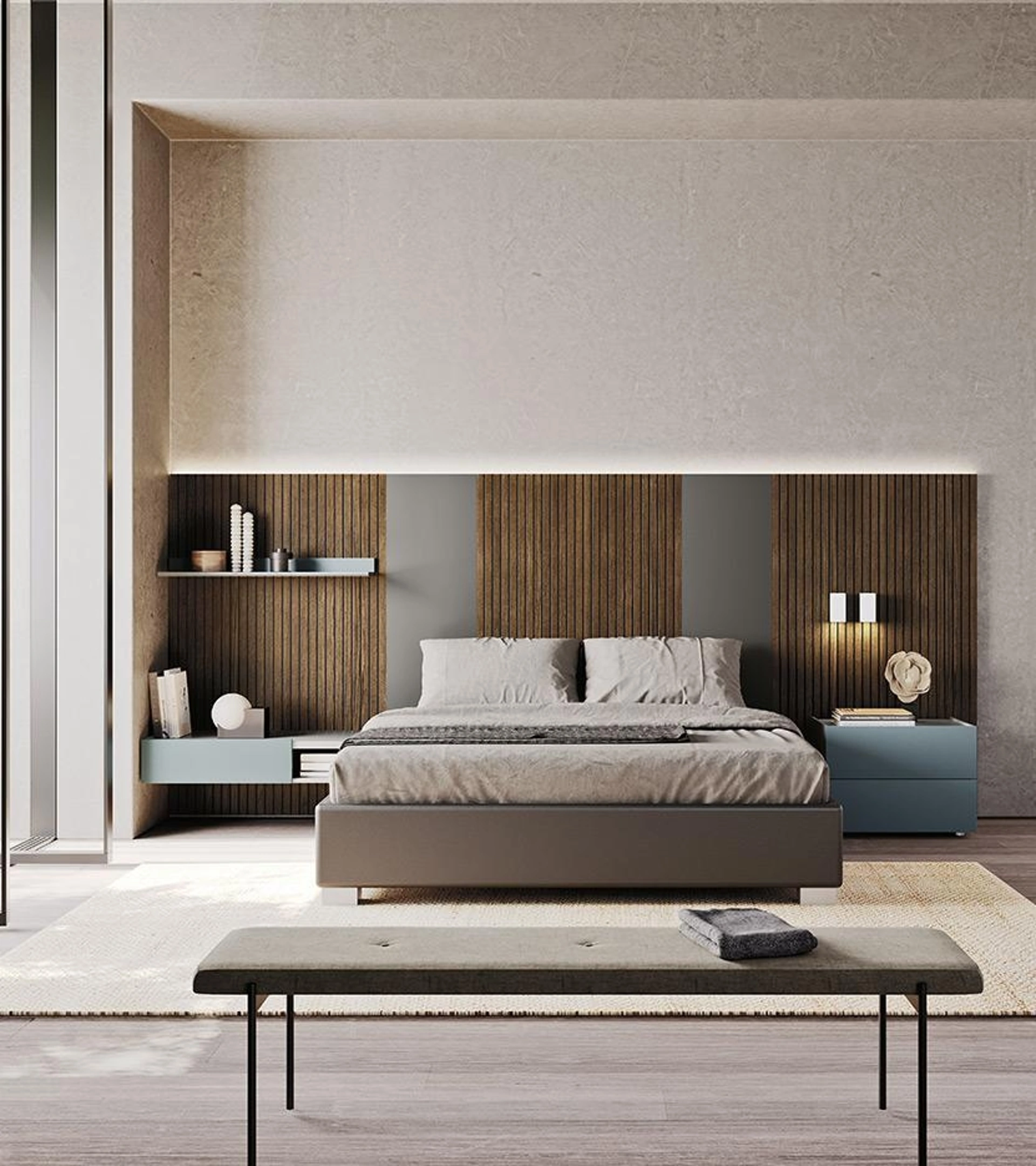 Se desideri letti matrimoniali con testiera, ecco qui il modello Sistema Sipario in legno per impreziosire la camera da letto.