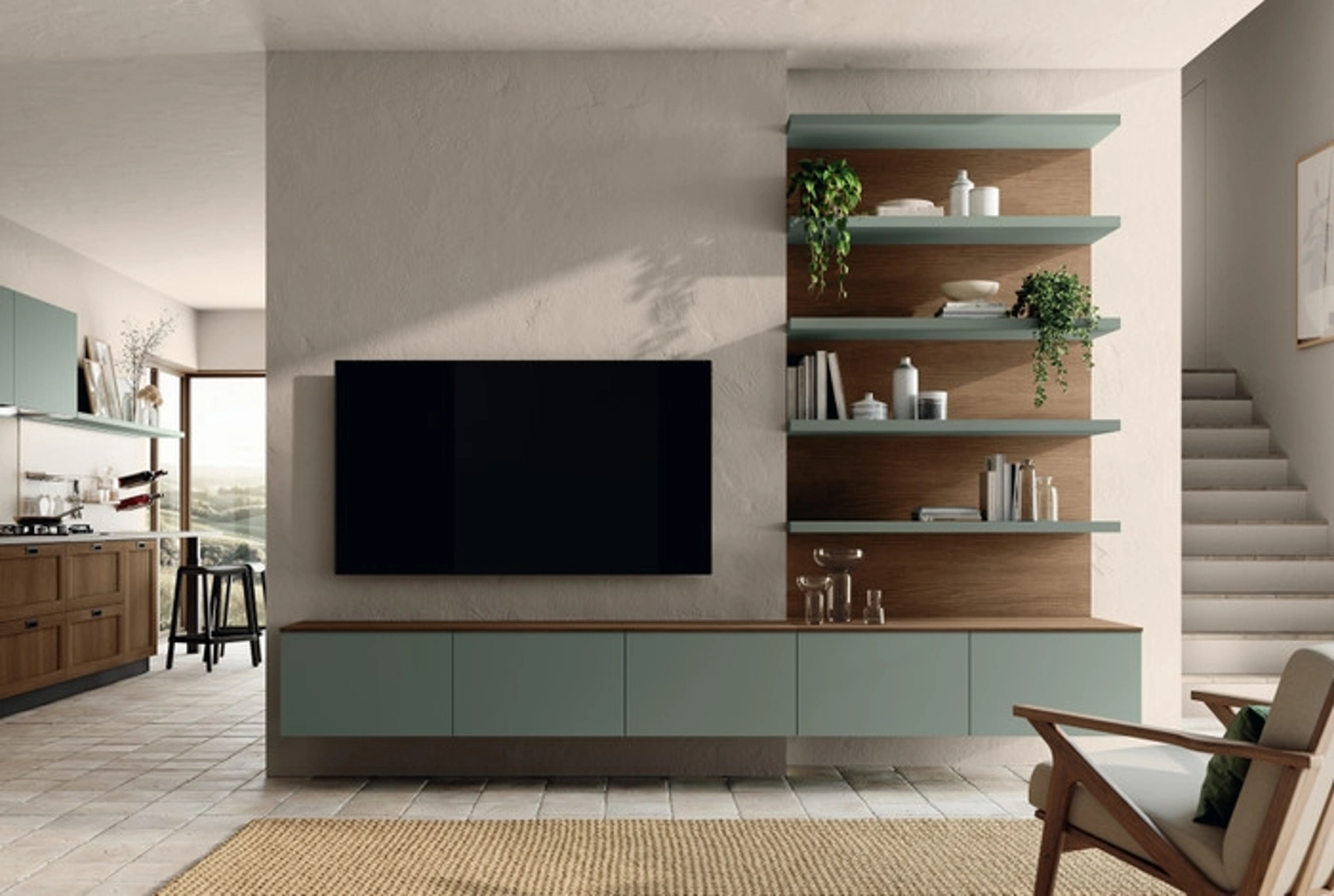 Vuoi progettare un soggiorno dinamico e operativo? Ecco a te la parete attrezzata Living Moda 03 Scavolini dalle forme decise moderne.